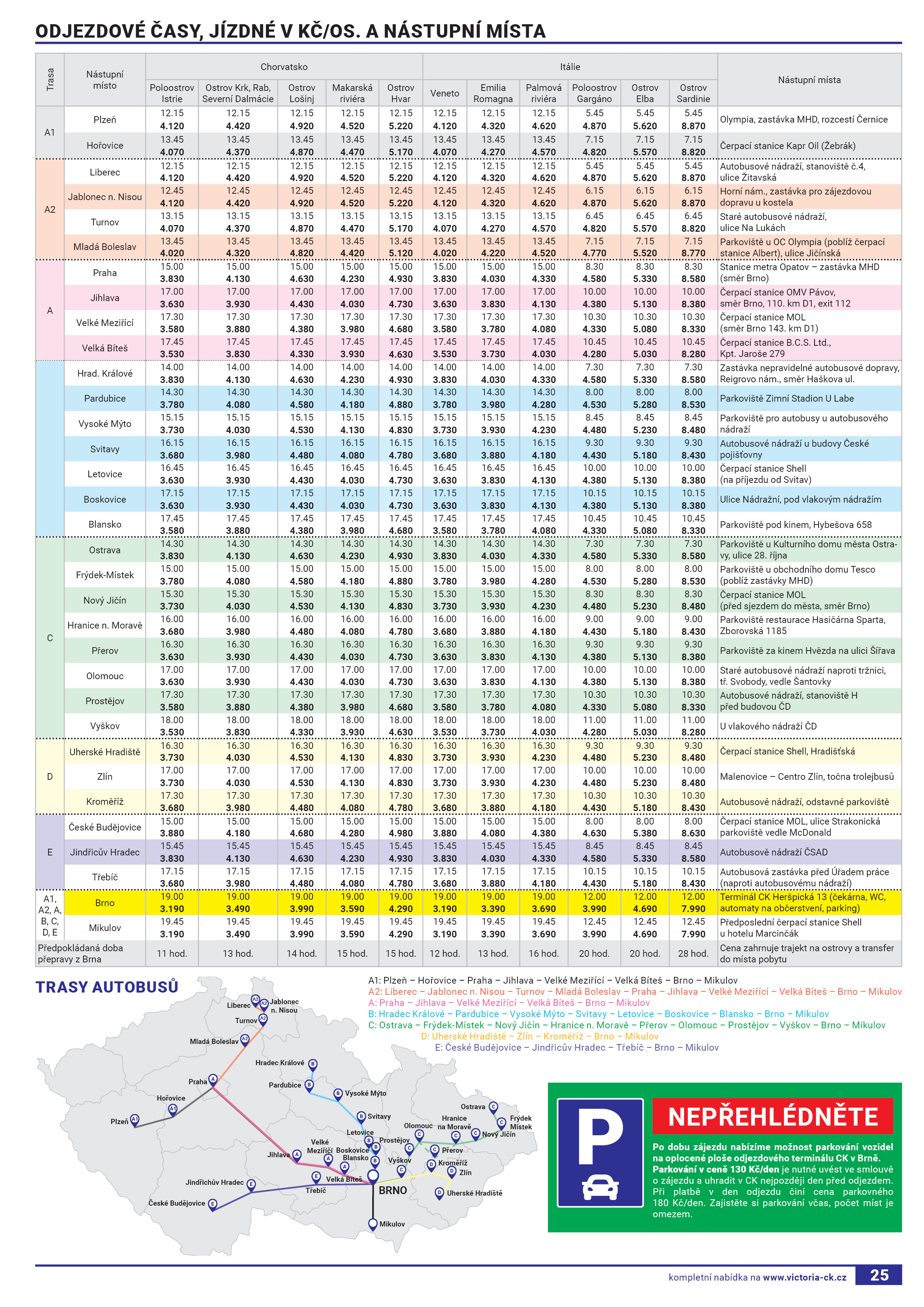 - CK v návaznosti na počet klientů z jednotlivých odjezdových míst určuje trasu přepravy do a z místa pobytu; časy odjezdů (viz str. 25) nebo dle pokynů na cestu, při současném zachování tabulkových cen jízdného. CK si vyhrazuje právo na změnu hodiny odjezdu, popř. na změnu trasy přepravy. Pokud má změna trasy za následek nemožnost nástupu nebo výstupu na předem potvrzeném místě, hradí CK náhradní dopravu do nejbližšího možného nástupního nebo výstupního místa autobusovou linkou nebo vlakem 2. třídy.